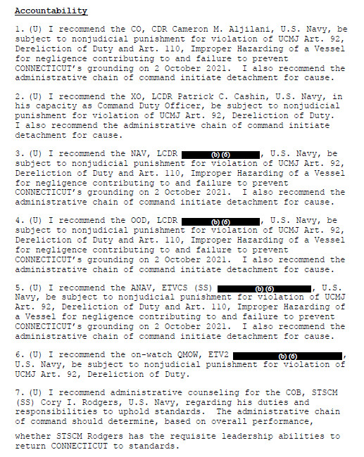 Of the investigation’s recommendations, seven cover disciplinary action or formal counseling for members of the crew, as are seen below. Three that are more specifically for CTF-74 are all redacted.