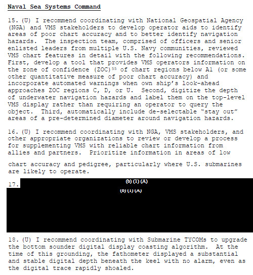 The report recommends that Naval Sea Systems Command (NAVSEA), in cooperation with the National Geospatial Intelligence Agency (NGA) and “VMS stakeholders,” look into improving the accuracy of underwater survey data where possible, to include more accurate details regarding known underwater hazards.