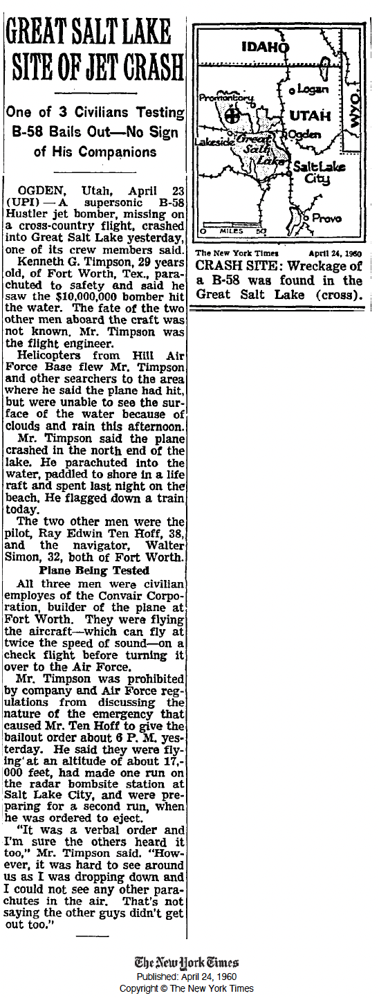 As for what happened to the B-58 in the Great Salt Lake, that remains a puzzle. Air Force sources don’t reveal whether some or all of the Hustler’s wreckage was recovered and, at the time, these details were highly classified. Bearing in mind that the aircraft was still very new, and a highly expensive asset, it would seem likely that they would want to retrieve as much they could of it for a thorough investigation. If anyone out there knows more about what happened to the B-58, we would love to hear from them.