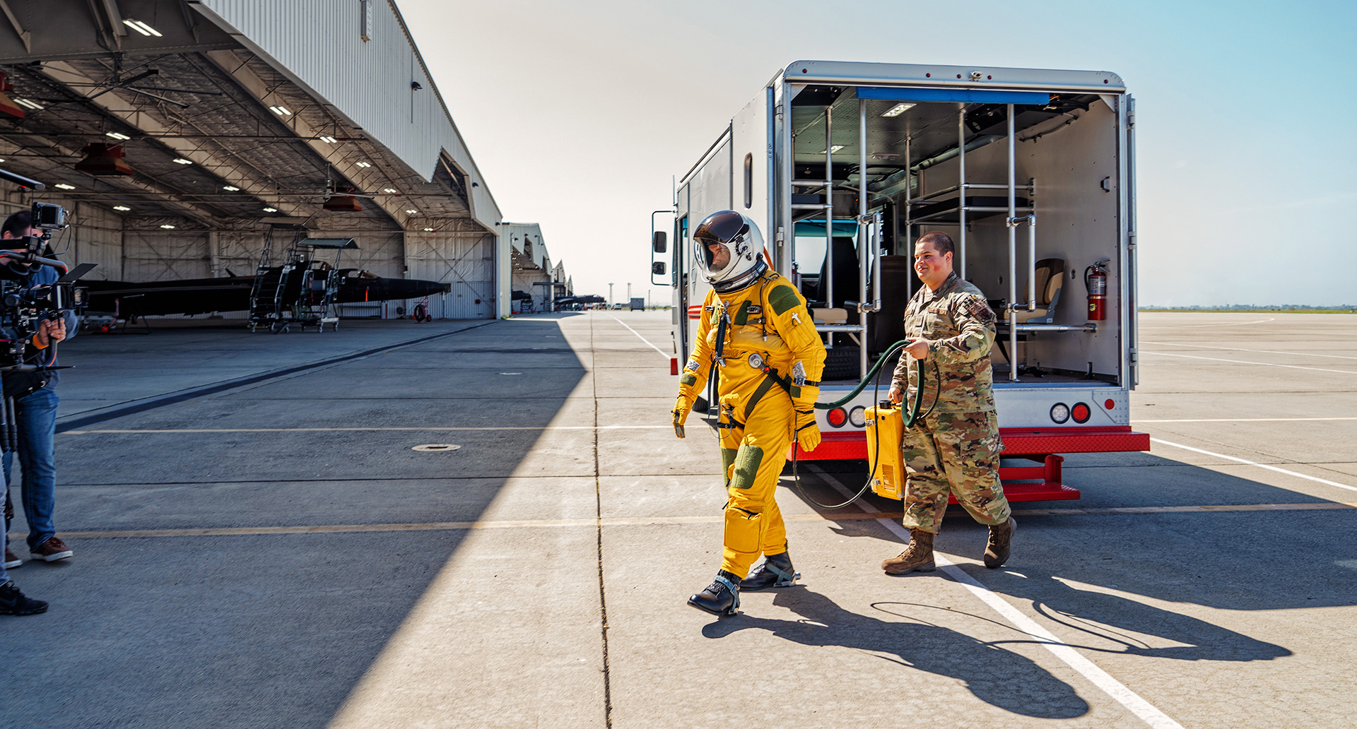 “The spacesuit was tailored so that if a rapid decompression happened, the pilot’s arms would stay down so that they could eject from the plane. This made it difficult to photograph, as the suit fights you when trying to raise your arms with a camera. On top of this, I would have to rely on a liquid-crystal display (LCD) screen as the fishbowl on my head made it impossible to use the regular viewfinder. These were only some of the considerations I had to think about daily.”