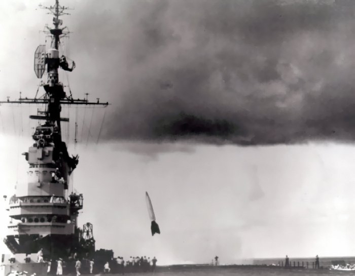 Meanwhile, the U.S. Navy was also investigating the potential of ballistic missiles in future warfare. This culminated in Operation Sandy, when a V-2 rocket (assembled and prepared at White Sands) was launched from the deck of the USS Midway – the largest carrier in the Navy – in a position south of Bermuda. It was not a particularly successful endeavor and the future of naval launches of long-range rockets was cast into doubt for a fair while afterwards. In this it mirrored somewhat the Germans’ own failed attempts to launch a V-2 from a submarine-towed platform, perhaps as a means to attack the U.S. East Coast during the war.