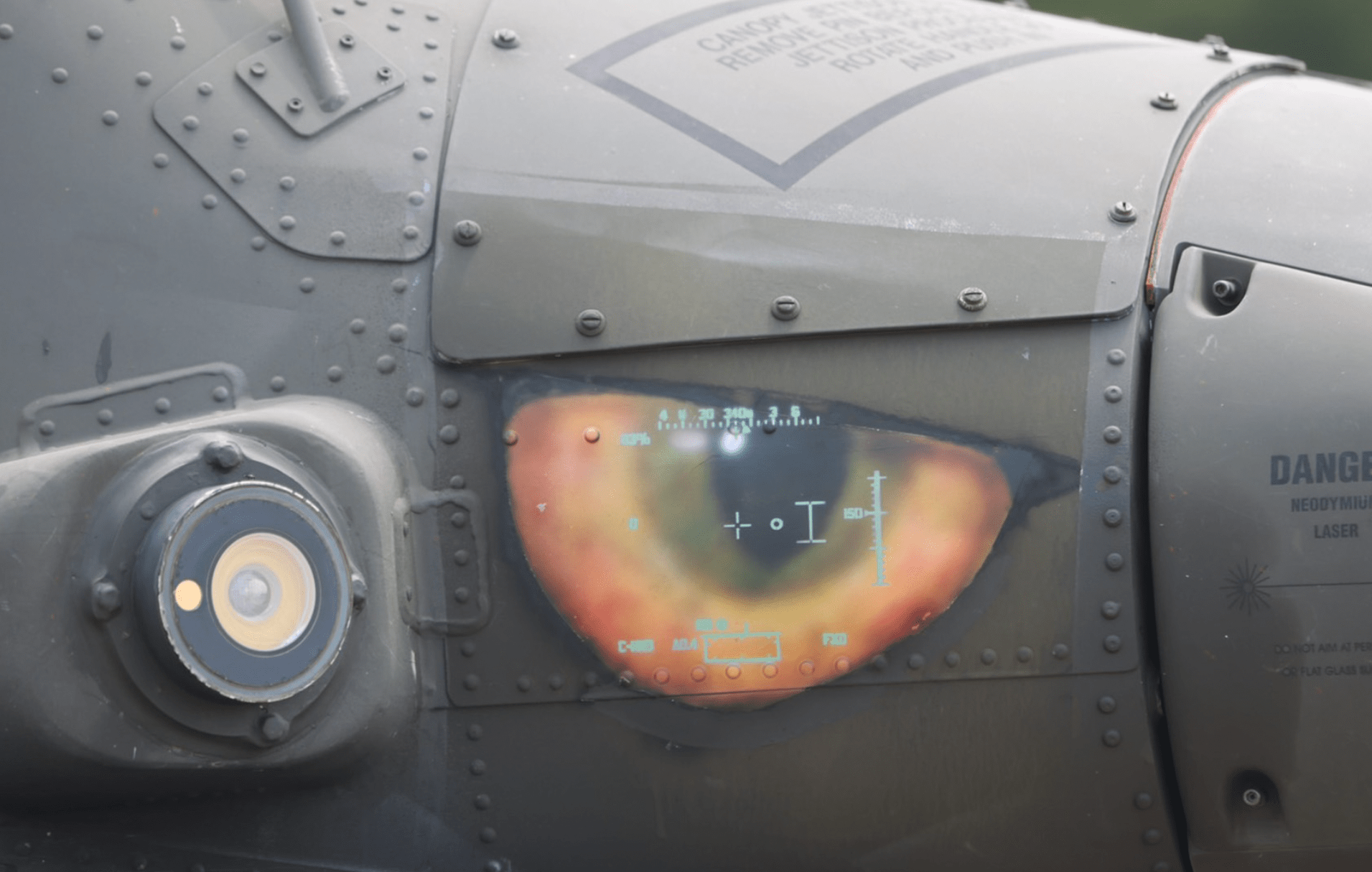 The attention to detail extends to the ‘eyes,’ which are overlaid with targeting symbology — a nod to the information projected into the Apache crew’s iconic ‘monocles.’