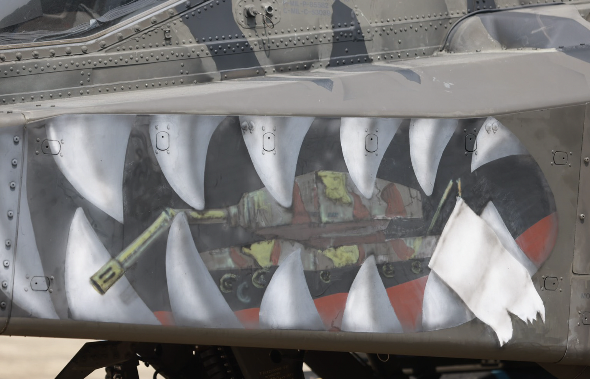 Not only do the helicopters’ fuselages sport stripes over their standard olive drab exterior, but the forward fuselages feature monstrous teeth and glaring eyes. On one side, those teeth are chomping on a tank, forlornly waving a white flag of surrender.