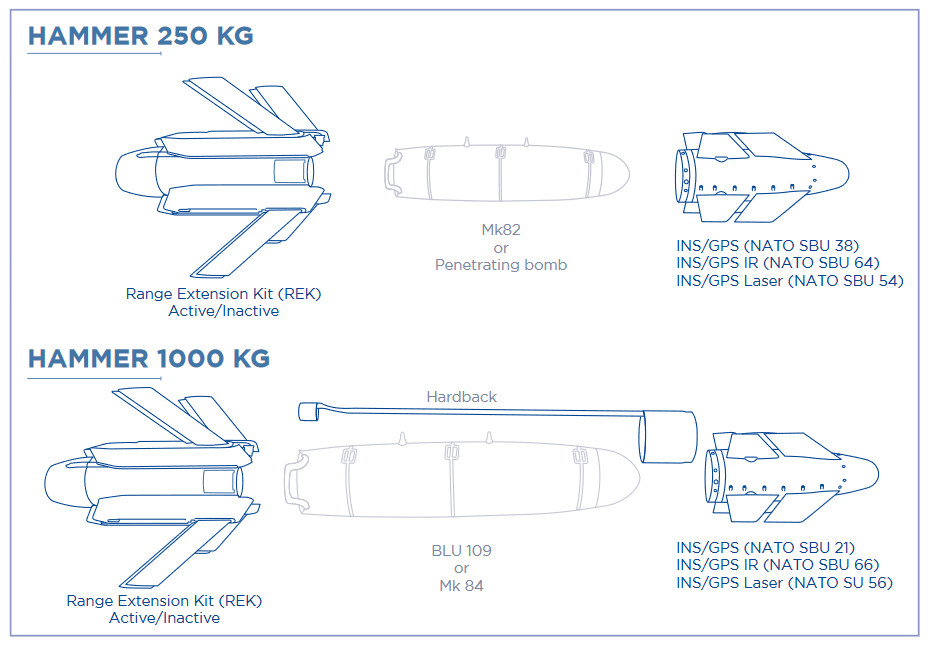 Hammer kits have also been developed for use together with 276-pound (100-kilogram), 1,100-pound (500-kilogram), and 2,200-pound (1,000-kilogram) bombs. Safran notes that Hammers can built around bunker buster type bombs like the 2,000-pound-class U.S. BLU-109/B, as well as general purpose high-explosive types.