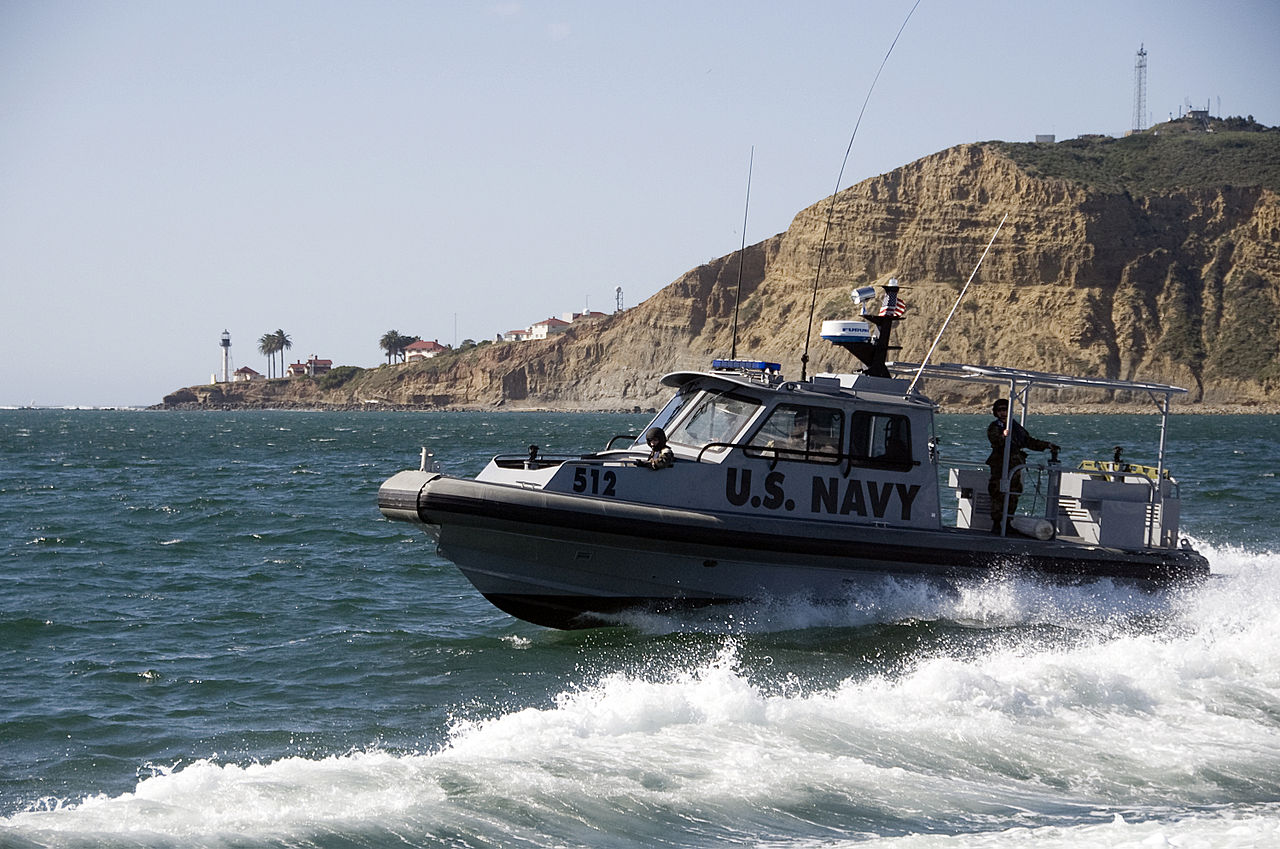 The Sea Ark Dauntless is an aluminum vessel with a deep vee hull design, according to its manufacturer, U.S. Watercraft. It has a 12-foot beam, 3.2-foot draft, and can carry up to seven tons with a maximum 850 horsepower. These boats are very commonly used for force protection in port areas where Navy ships operate from.