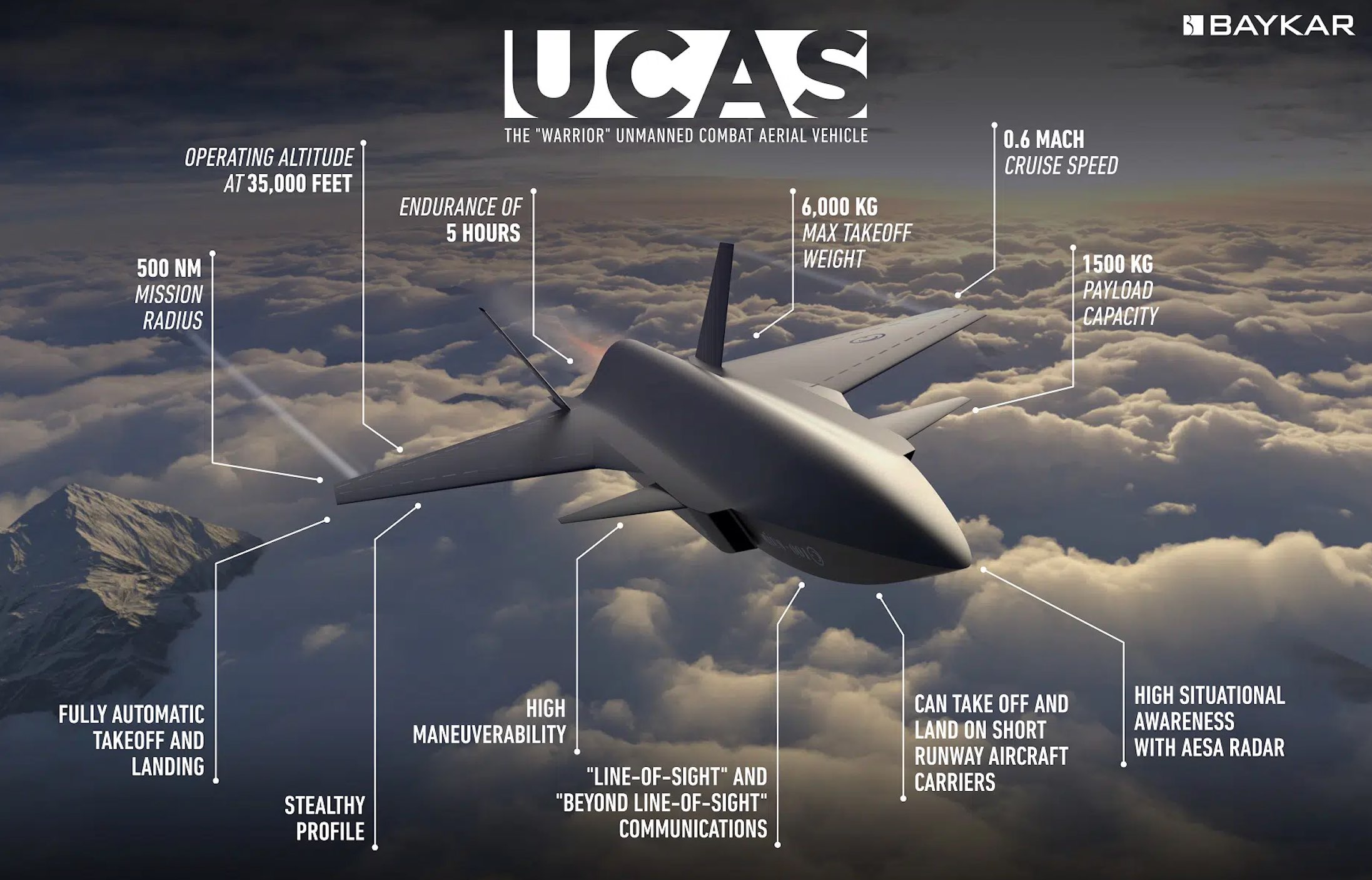 Kizilelma, which The War Zone has previously profiled, is tailored for the sort of air combat missions usually performed by manned fighter aircraft. Powered by a single Ukrainian-designed Ivchenko-Progress turbofan engine, the system boasts a canard-delta configuration and, at least on later versions, is supposedly capable of supersonic flight. The Kizilelma should have an endurance of around five to six hours, a service ceiling of 35,000 feet, and a combat radius of 500 nautical miles. With a maximum takeoff weight of 13,228 pounds, Kizilelma will boast a payload capacity of 3,306 pounds and will likely support various Turkish air-to-ground precision munitions and air-to-air missiles.