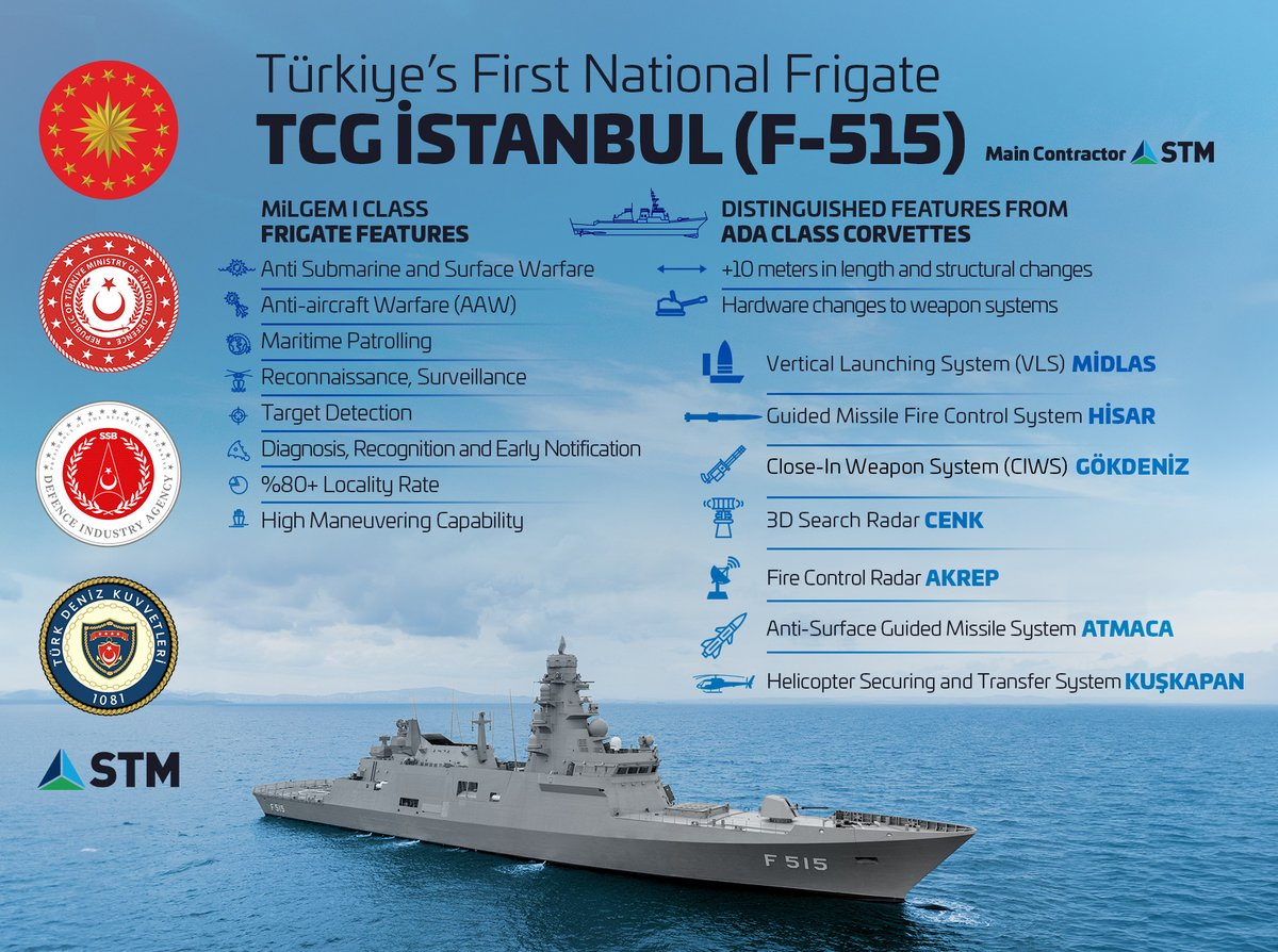 “TCG Istanbul is equipped with the ADVENT combat management system, developed by Havelsan, enabling advanced capabilities in network-centric warfare. Additionally, the Turkish Navy is welcoming the AESA technology with the installation of the CENK-S radar on the ship. With an arsenal of 16 Atmaca anti-ship missiles, TCG Istanbul boasts formidable surface weaponry.”