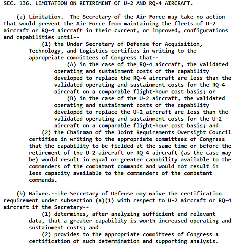“In the case of the U-2 aircraft,” the key demand is that “the validated operating and sustainment costs of the capability developed to replace the U-2 aircraft are less than the validated operating and sustainment costs for the U-2 aircraft on a comparable flight-hour cost basis.”