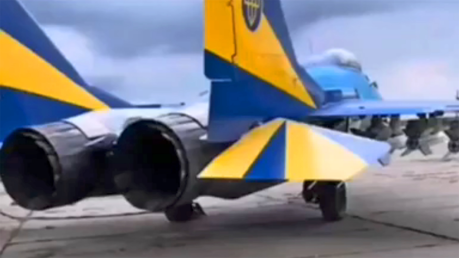 The single-seat MiG-29 seen in the video in question, now widely shared on social media, does indeed wear a blue and yellow paint scheme that bears some similarities to those that were applied to the jets flown by the Ukrainian Falcons. Compared with the two different schemes used by the Ukrainian Falcons, however, the jet in the video looks significantly different, with none of the large areas of white on the fuselage, the red cheatline, or titles.
