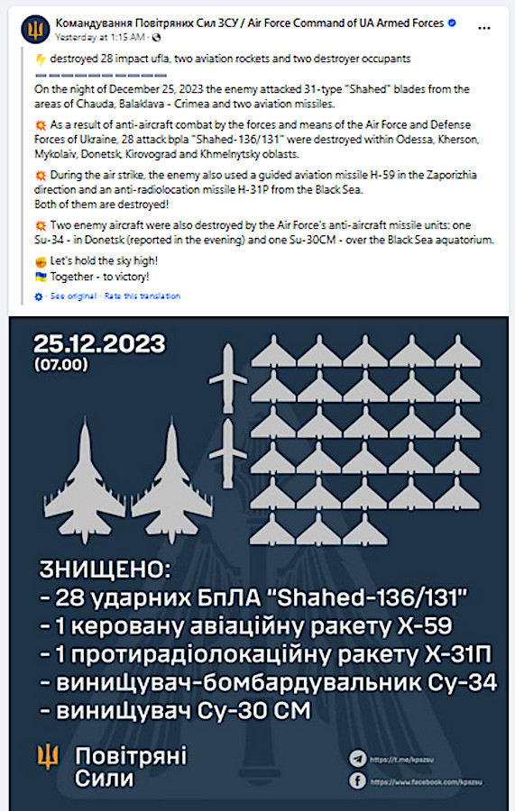 The War Zone has not been able to independently verify any of these shootdowns and, at the time of writing, the Russian government does not appear to have confirmed or denied any of these claimed losses. The Russian-language Fighter channel on Telegram, which has strong ties to Russia’s Air Force, said that there were losses on December 22, but denied that the Su-34 and Su-30SM were destroyed on Christmas Eve.