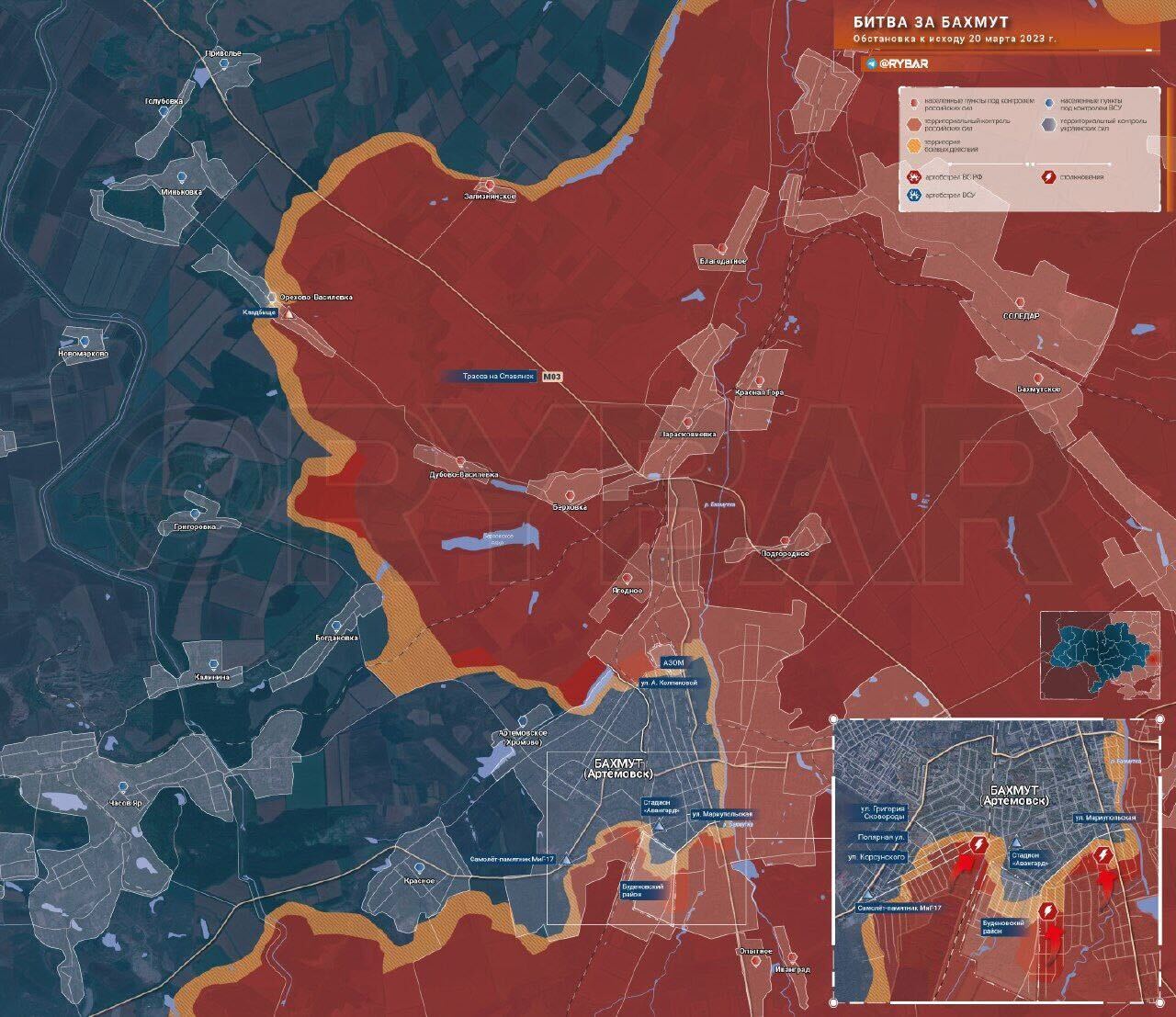 “The head of a private military company, Yevgeny Prigozhin, said that more than 70% of the settlement had already been liberated,” according to Rybar. “Despite the difficult situation, the Armed Forces of Ukraine are preparing a counteroffensive by March 24 in the Bakhmut sector. Significant reinforcements were transferred from the cities of Kyiv, Sumy, Kharkov and Chernigov to the Chasov Yar-Konstantinovka line. By activating at Bakhmut, the Ukrainian authorities intend to demonstrate to Western countries the readiness of the Armed Forces of Ukraine for the spring-summer campaign and convince them to speed up the supply of military equipment.”