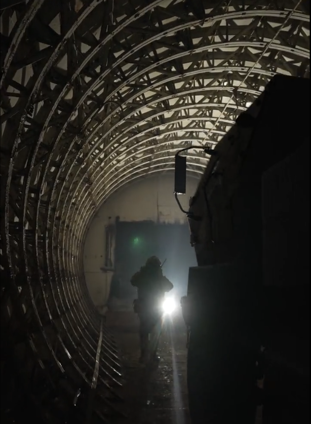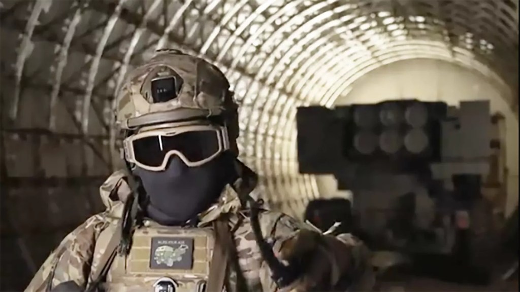 The video then cuts to the soldier standing inside what appears to be a shelter with circular metal-ribbed support beams, as he waves a HIMARS launcher inside and continues his message.