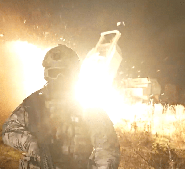 The video then cuts to the soldier standing back outside as a HIMARS system prepares to fire.