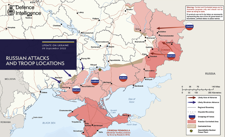 In its latest assessment, the U.K. Defense Ministry map does not address a specific counter-offensive near Kharkiv, but it shows Ukrainian attacks on the Russian-held Kherson Oblast and continued fighting near Kharkiv.
