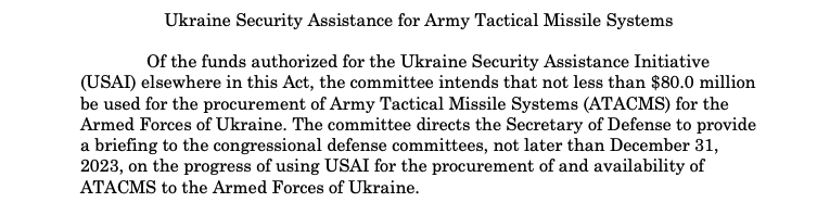 “The committee directs the Secretary of Defense to provide a briefing to the congressional defense committees, not later than December 31, 2023, on the progress of using USAI for the procurement of and availability of ATACMS to the Armed Forces of Ukraine,” the chairman’s mark reads.