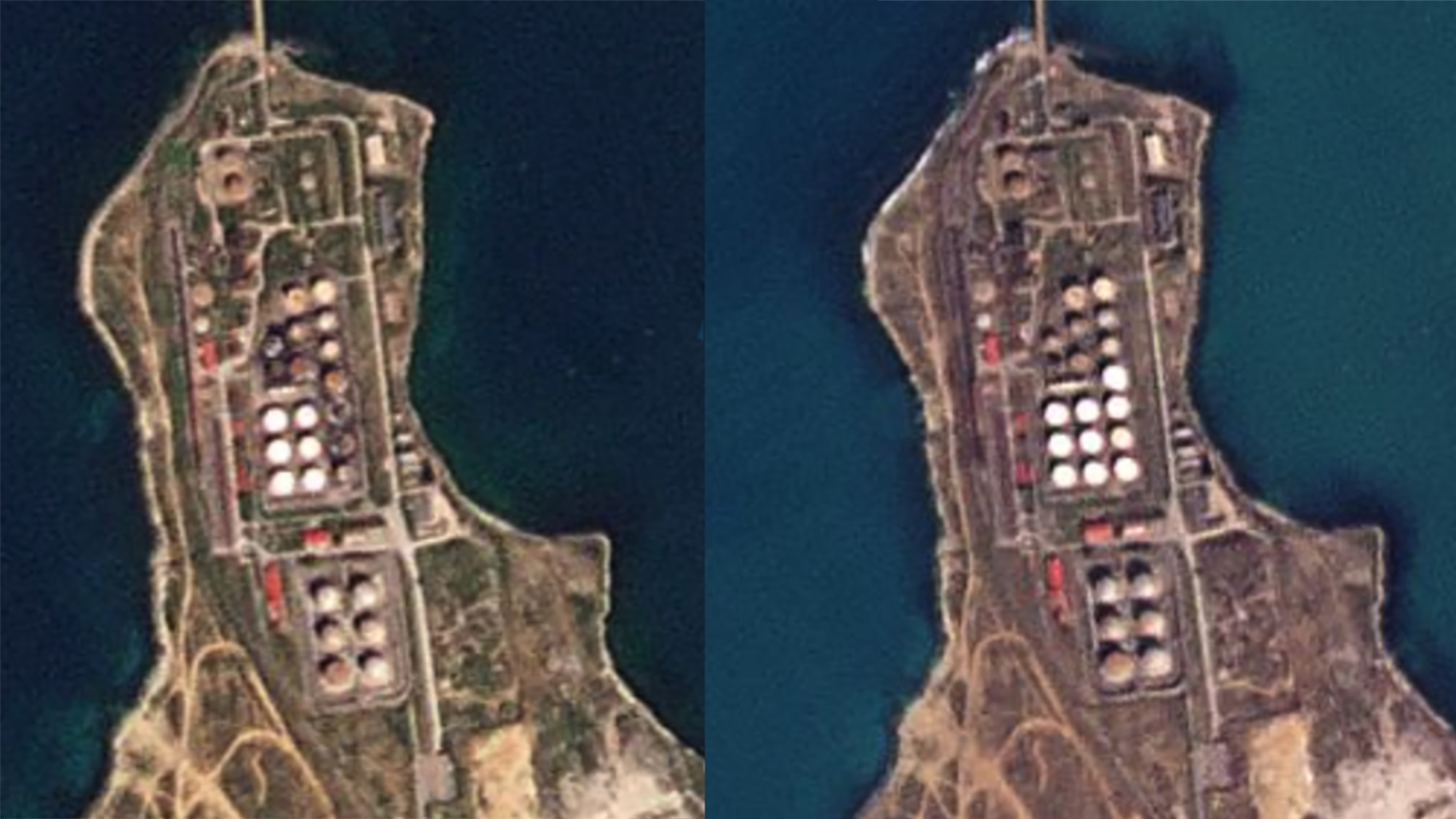 The image below on the right shows how the fuel depot complex at Kozacha Bay looked before the attack. The image on the left shows what it looked like after the attack. At least four tanks on the right row appear to be destroyed while additional tanks look like they were damaged, as well.