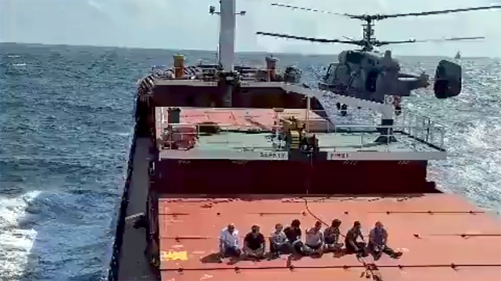 The patrol ship then fired warning shots from “automatic small arms” before a Ka-29 helicopter landed a Russian boarding party. Video from aboard the ship shows the Ka-29 “Helix-B” twin-rotor helicopter hovering just above the Okan‘s deck while a number of people believed to be the ship’s crew sit detained on one of the cargo hold doors.