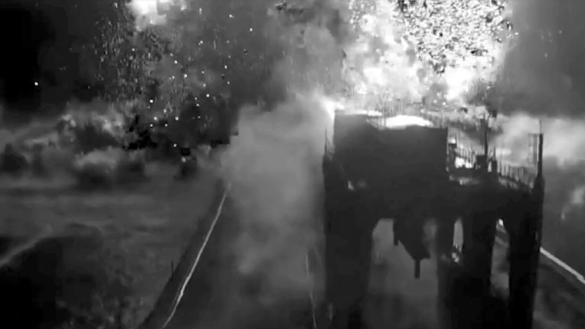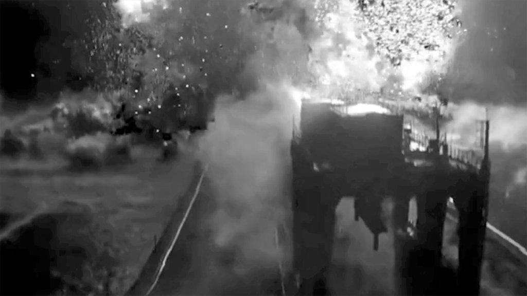 Footage shows Russian forces blowing the bridge at Nova Kakhovka Dam after fleeing the Dnieper’s western bank on November 11.