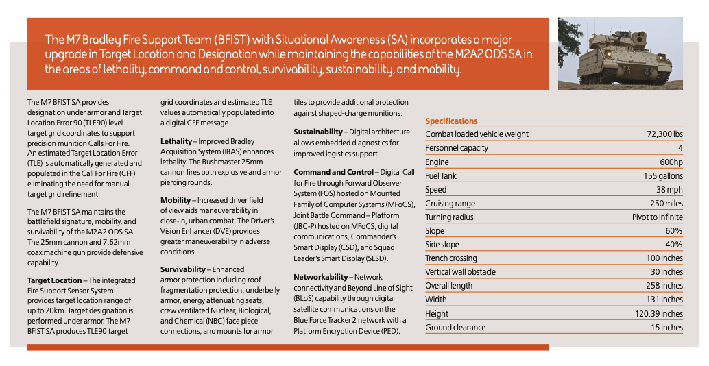 “Depending on their levels of fires integration, it’s a pretty good sensor-to-shooter link platform,” a veteran Bradley master gunner who spoke on condition of anonymity to discuss the vehicle’s attributes told The War Zone Monday morning. ”With a laser designator in place of a TOW [missile package], and the room to carry requisite computers and radio equipment, it is a one-stop shop for fires.”