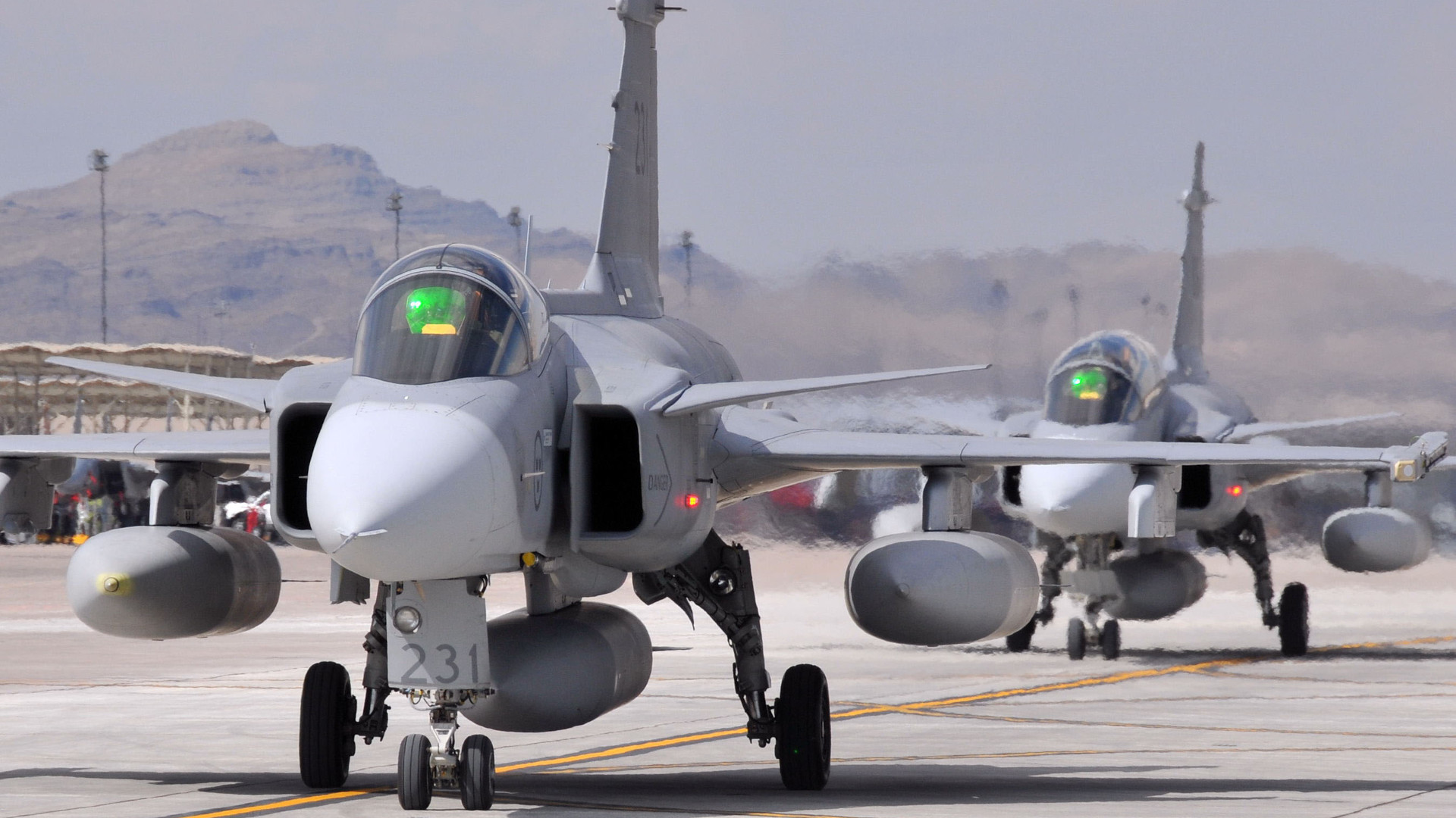 “Their single F404-derivative engine (license-built by Volvo) drinks comparatively small amounts of fuel compared to the other options and the type has a wide array of available armory from multiple nations. It has all-around good performance, modern radar and avionics, and is small in size, making it hard to spot visually.“