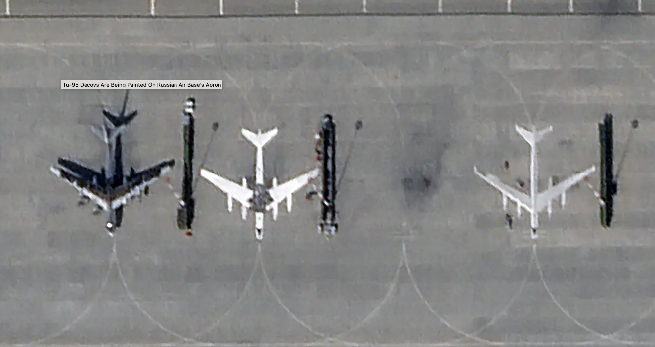 While Russia also makes use of battlefield decoys, it’s not known to have employed decoy aircraft so far. However, it has employed a variety of other measures to try and protect its aircraft when they are parked on their airfields. These include the bizarre arrangements of tires that are very likely intended to confuse the image-matching algorithms used by certain hostile missile seekers. Satellite imagery has since shown that Russia is painting the silhouettes of strategic bombers in parking revetments at least one of its bases, as you read about here.