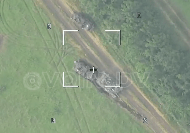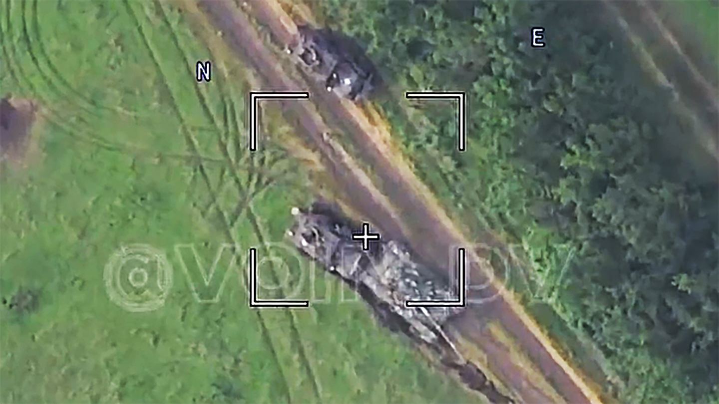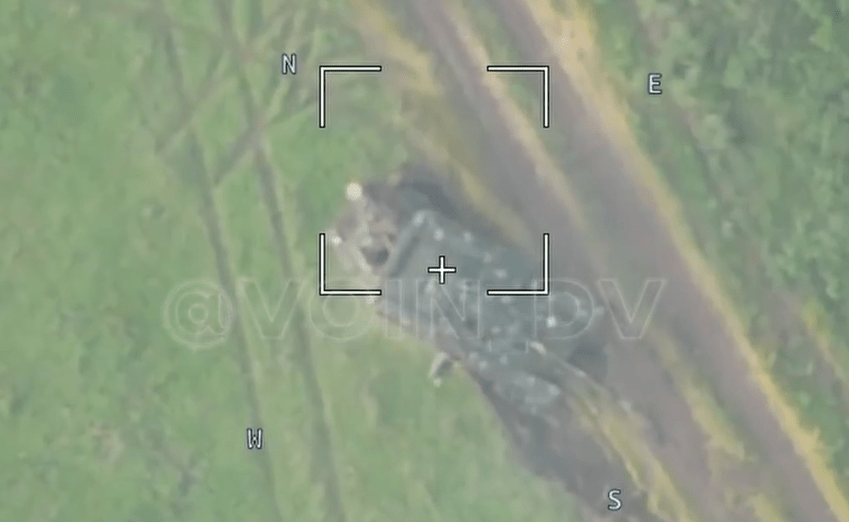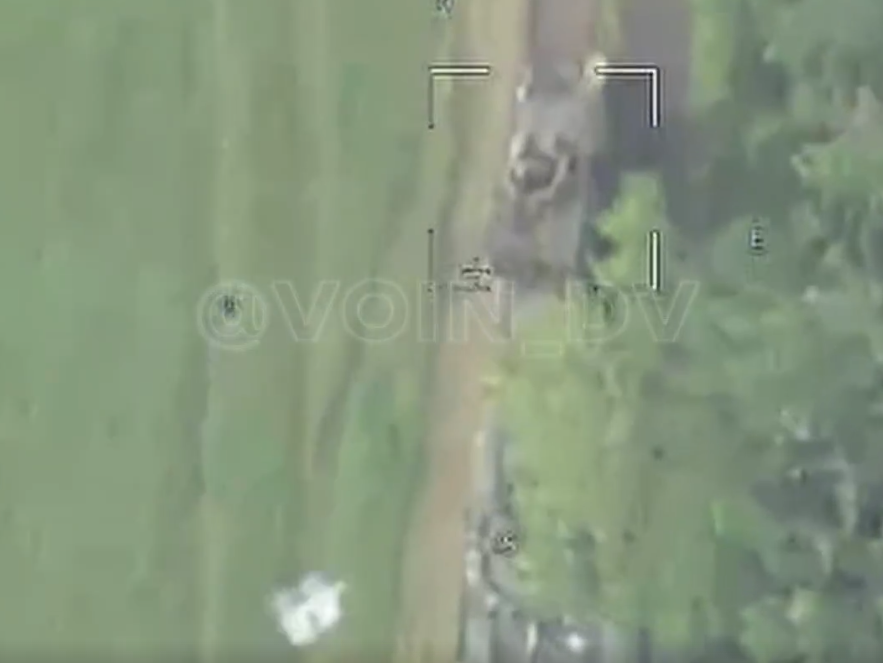 A bizarre video posted this morning by the Russian VOIN DV Telegram channel appears to be a Russian drone’s view of a Ukrainian T-72 Tank rolling over and crushing a Ukrainian Mine Resistant Ambush Protected (MRAP) armored vehicle as some crew members frantically flee.