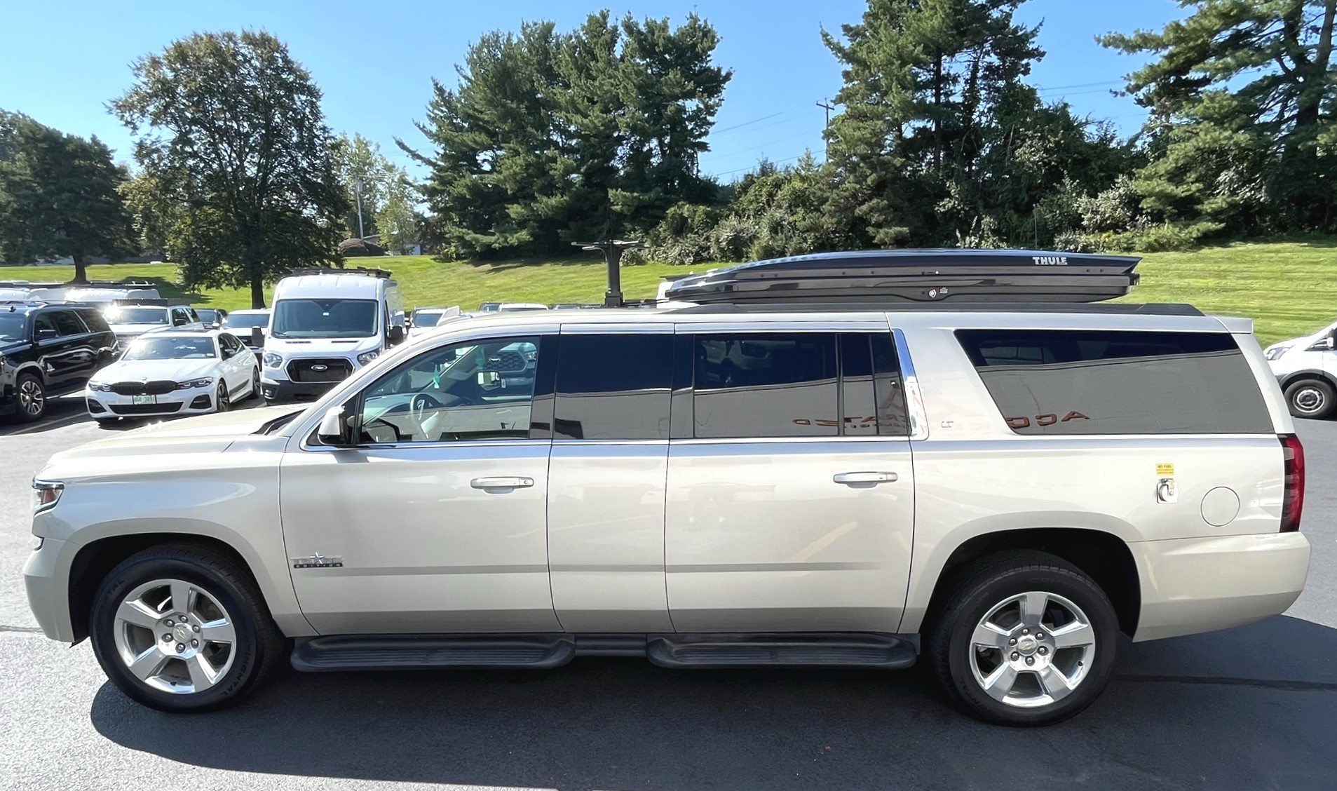 Photographs of the four-door vehicle show an X-shaped antenna, a design that is typically associated with UHF satellite communications systems. What appears to be the base for a whip-type communications antenna is also seen at the rear of the roof on the right side. It also has a Thule roof storage box.