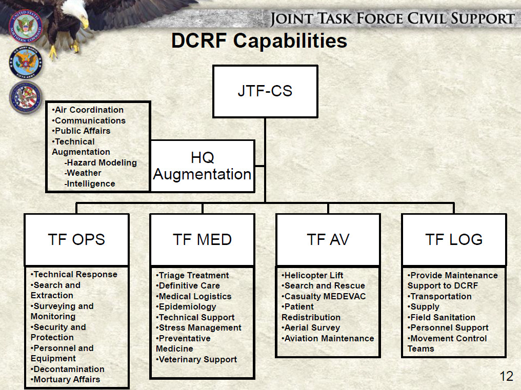 “JTF-CS anticipates, plans, and prepares for chemical, biological, radiological, and nuclear (CBRN) response operations,” is how one unclassified 2012 briefing describes the task force’s primary missions. “When directed, JTF-CS deploys to command and control DOD forces and conducts CBRN response operations in support of civil authorities in order to save lives, prevent further injury, and provide temporary critical support to enable community recovery.”