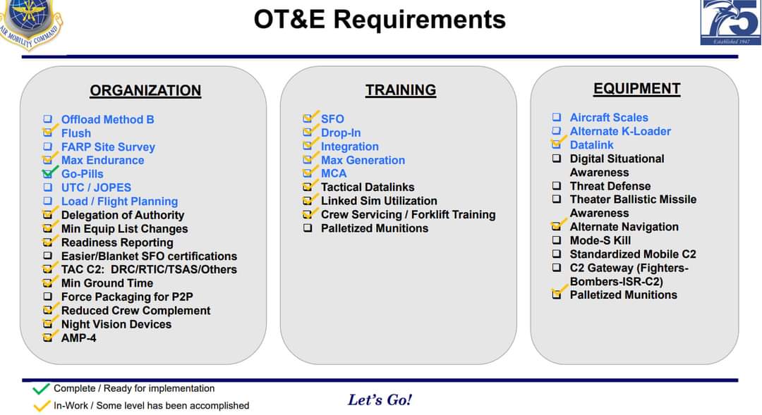 A slide showing the OT&E requirements identified during the Fall PHOENIX Rally event, which took place last year, lists numerous organizational, training, and equipment-related items. Only one item, “Go-Pills,” a term used to describe stimulants prescribed to pilots and other aircrew for very long duration missions, is marked with a green check mark, denoting it was already being “Completed / Ready for implementation” at that time. A number of others, including organization efforts to further improve “max endurance” and the acquisition of equipment related to things like “palletized munitions” are marked with yellow checks to indicate “In-Work / Some level has been accomplished.”