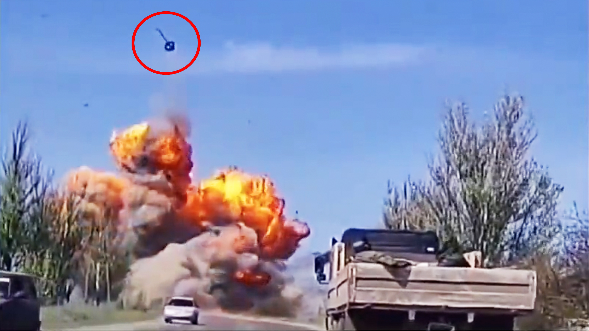 According to a Chinese news broadcast, what they claim to be the turret of a Russian T-72B3 tank took to the skies on May 6 after an attack was carried out by Ukrainian forces near Novoazovsk in the Donetsk region. How the attack was executed is currently unknown, but the video recorded and broadcasted by China’s Phoenix Television makes for some absolutely bonkers footage.