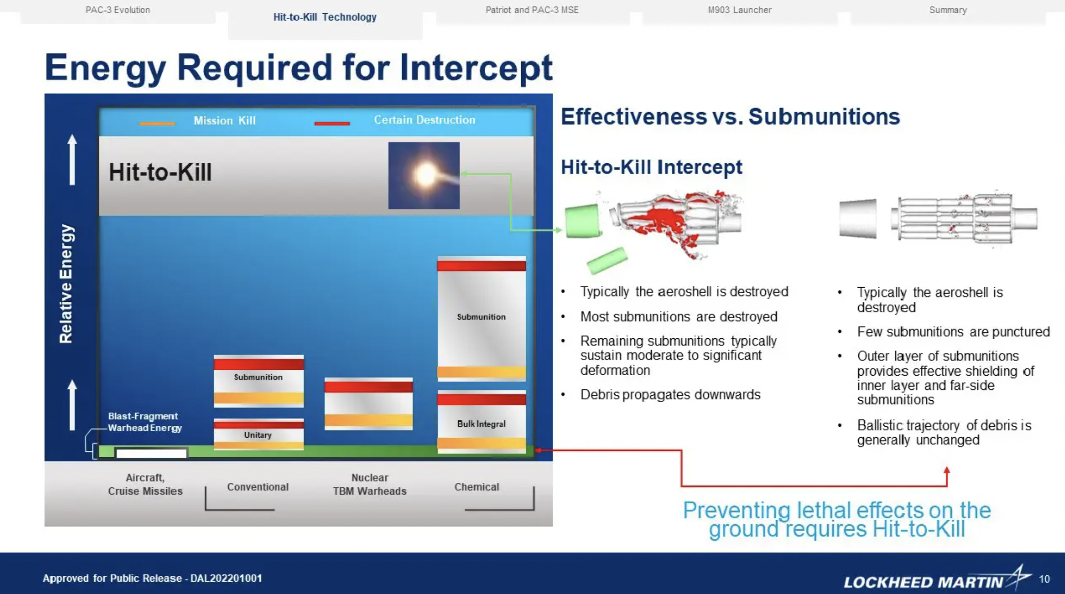 The size and shape of the PAC-3s are by-products of them being ostensibly so-called “hit-to-kill” interceptors. This means they are designed to destroy their targets by physically smashing into them. This separates them from older Patriot missiles, which feature large blast-fragmentation warheads.