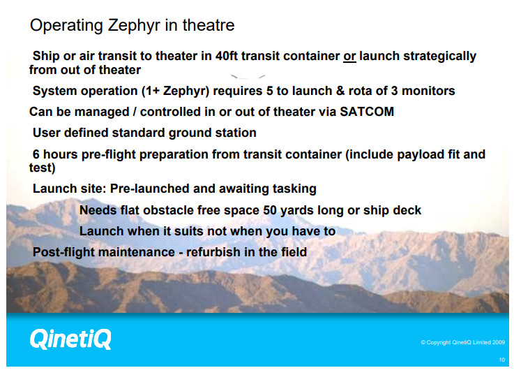 A briefing that QinetiQ presented at a science and technology conference hosted by U.S. European Command (EUCOM) and U.S. Africa Command (AFRICOM) in 2009 specifically outlined how a “constellation” of these drones might be used to provide persistent sensor coverage along the coast of Somalia with a “low cost and [with a] low manpower footprint.” That presentation came after a U.S. Navy-led Joint Capability Technology Demonstration (JCTD) had been conducted the year before using an earlier Zephyr model on loan from the British government.